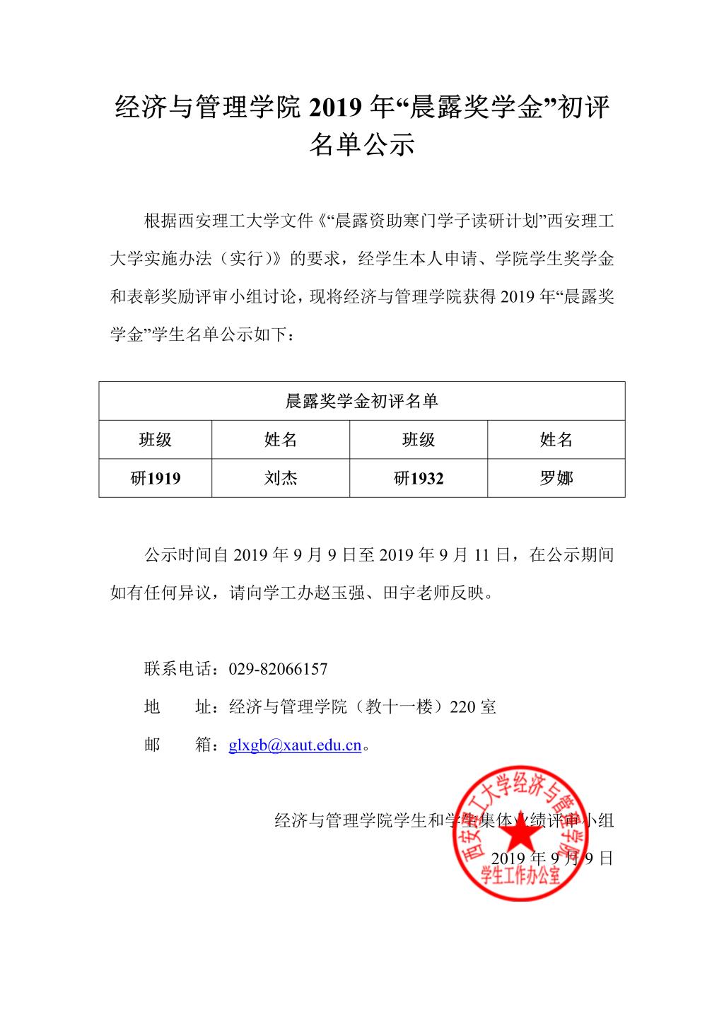 2019年“晨露奖学金”初评名单公示