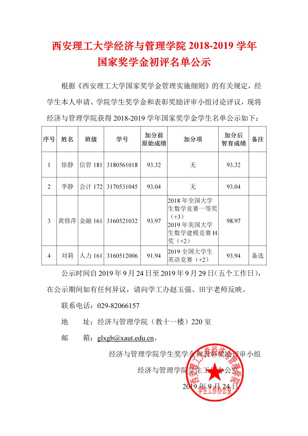 2018-2019学年国家奖学金初评名单公示