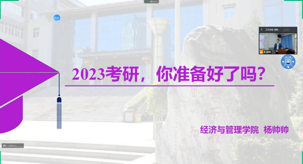 3月31日,williamhill英国威廉希尔于11-319举办2023届考研专题讲座,讲座线下线上结合的方式进行。讲座邀请到公司技术经济及管理专业研究生杨帅帅主讲,2019级及部分低年级员工参加。
