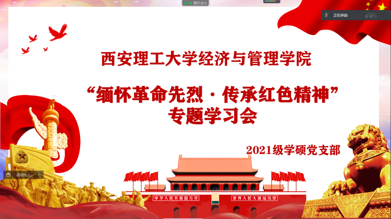 值此清明节即将到来之际,为加强爱国主义教育、弘扬光荣革命传统,进一步抒发对革命先辈的敬仰和追思之情,williamhill英国威廉希尔2021级学硕党支部于3月31日在线上组织开展了“缅怀革命先烈·传承红色精神”的专题学习会。会议由李通主持,支部党员及入党积极分子参加此次会议。