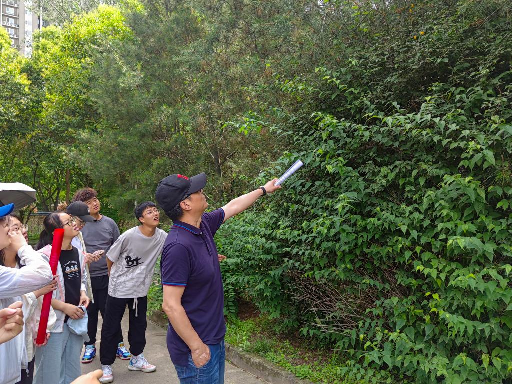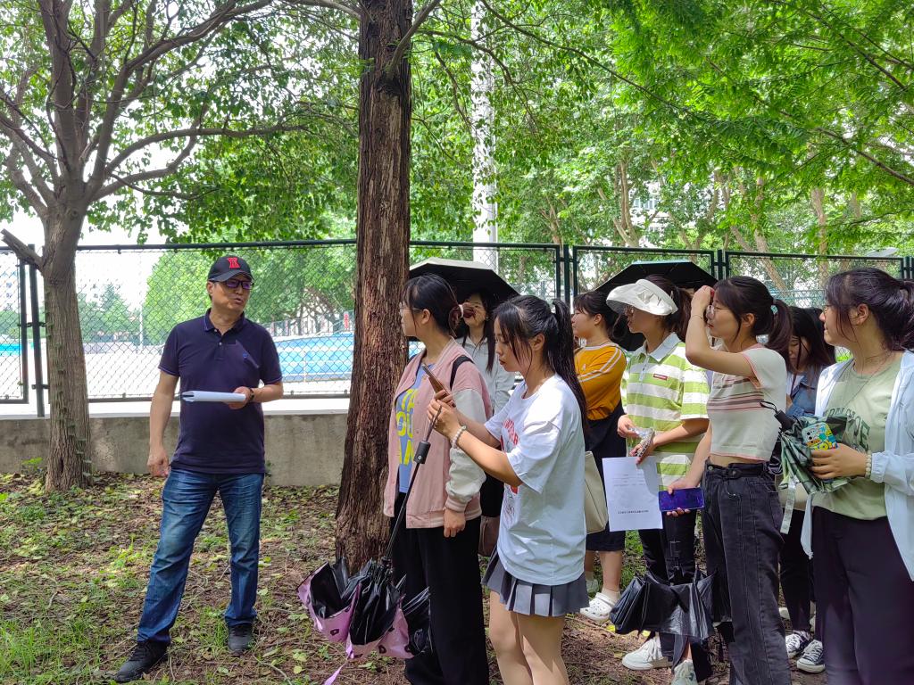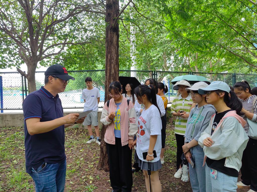 伴随着暮春午后的微微凉风,老师与同学们漫步在校园花草林木间,观察每一株植物的生长特点,欣赏自然之美。在老师幽默风趣的讲解中,同学们了解到校园内各类花草树木的生长习性及识别方法,在颇有趣味的历史故事中感受植物的“前世今生”,并于讲解过程中积极思考、与老师互动。活动过程中,任老师为同学们介绍了垂丝海棠、木瓜海棠等不同蔷薇科植物的辨识方法;通过观察不同种针叶林树木针叶的根数,判断生长习性;教11楼前由员工捐赠的灯台树,也因其独特的枝叶生长形态而格外珍贵;在操场旁的水杉林中,同学们了解到“活化石”——水杉生长环境的特殊性,老师为大家拓展讲解了这类树种的历史沿袭,为这类古老的植物蒙上一层“神秘的面纱”。在校园林荫道上种满的“二球悬铃木”——法国梧桐,是一球与三球悬铃木的杂交品种,与中国青桐不同,树形叶大荫浓,更为高大。同样,早在中国的《诗经》里就有关于梧桐的记载。在诗经,大雅的“卷阿”里,有一首诗写道:“凤凰鸣矣,于彼高冈。梧桐生矣,于彼朝阳。奉奉萋萋,雍雍嘴嘴。”进一步拓展了同学们的历史文学积累。