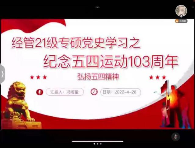 为引导广大员工党员积极传承红色基因,努力延续革命薪火,充分发挥党员的先进模范作用,在五四运动103周年来临之际,williamhill英国威廉希尔2021级专硕党支部于5月3日在线上开展了“赓续革命薪火 激昂五四精神”专题党史学习教育,本次活动由2021级专硕党支部宣传委员冯雨童主持。
