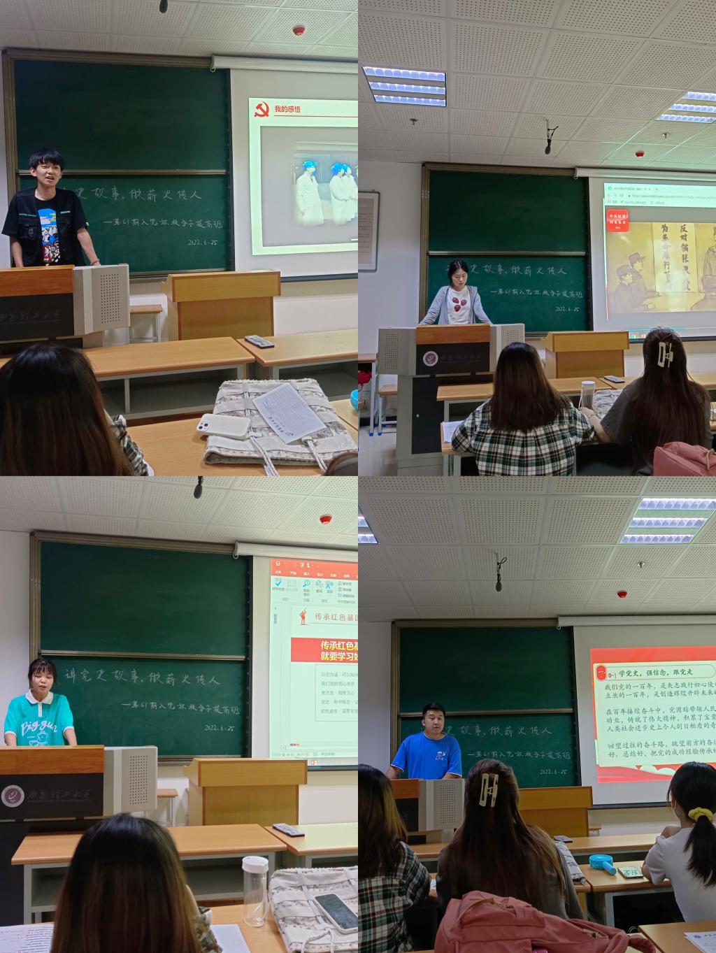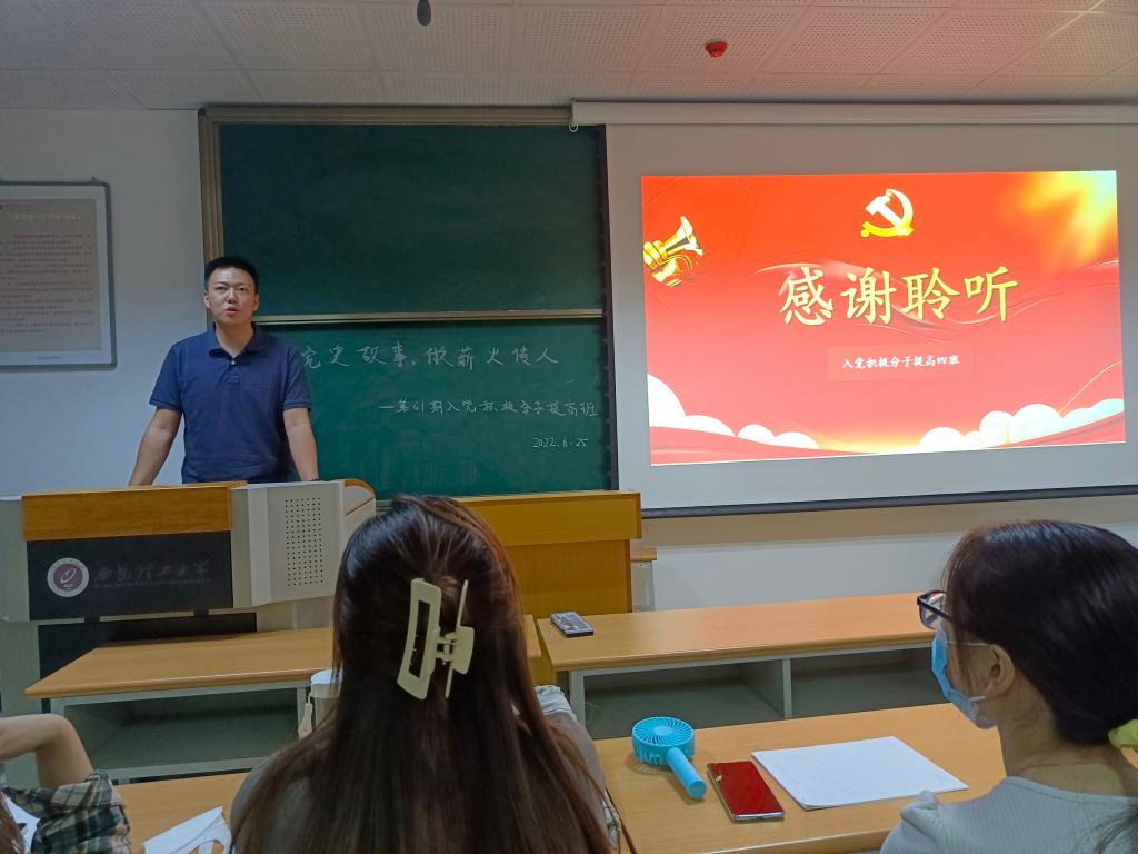 活动在提高班一班班长陈杨世梁的党史故事分享中拉开序幕。他由“赓续”的含义引出党课主题,介绍了邓稼先先生为国奉献的精彩故事,提出“稼先精神,一脉相承”,号召同学们心怀天下,胸怀梦想,为实现中华民族伟大复兴中国梦贡献出自己的力量。二班班长周凯雨则从“学党史,讲故事,悟精神,做传人”四个方面切入,强调“红色精神”是广大党员同志“补钙健体”的良药,她倡议参训学员认真学习红色故事,在知识学习中坚定发展脚步,争做薪火传人。三班班长罗天翔向同学们讲述了铁血师长陈树湘的故事,她提出要传承红色基因,学好党史中国史就必须以史为鉴,踔厉奋发,勇毅前行。四班班长董赟飞则从“红色凝聚力量,榜样引领成长”主题出发,分享了三位身边普通党员的先进事迹,并以此来激励大家从身边的小事做起,用实际行动做薪火“传承人”。任程宇最后做活动总结,他表示本次活动的目的在于通过“讲党课,明党史”的方式引导广大入党积极分子在党史故事中奋进拼搏,砺行修身,并展示公司提高班“育人于心”的课程特色,他希望同学们能在今后的学习生活中不断砥砺奋进,争取早日成为一名合格的中共党员。