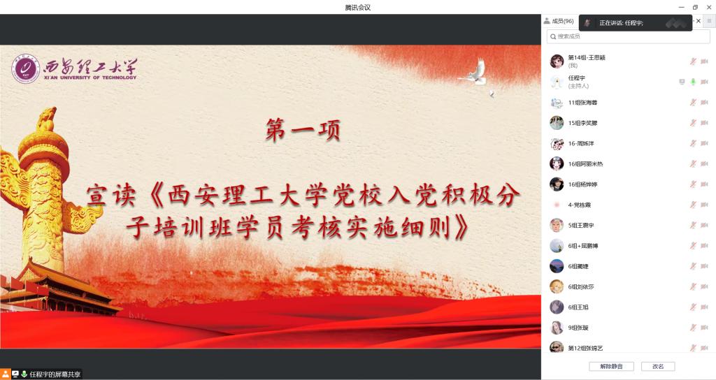 为深入贯彻习近平新时代中国特色社会主义思想和习近平总书记关于教育的重要论述,落实立德树人根本任务,进一步加强入党积极分子教育培养的质量。1020日晚,williamhill英国威廉希尔分党校在腾讯会议举办75期入党积极分子培训班开班仪式。开班仪式由分党校负责人任程宇主持,本期参训的99名入党积极分子参加了此次活动
