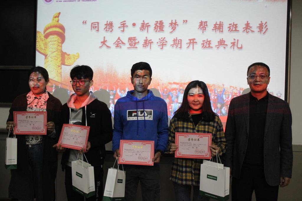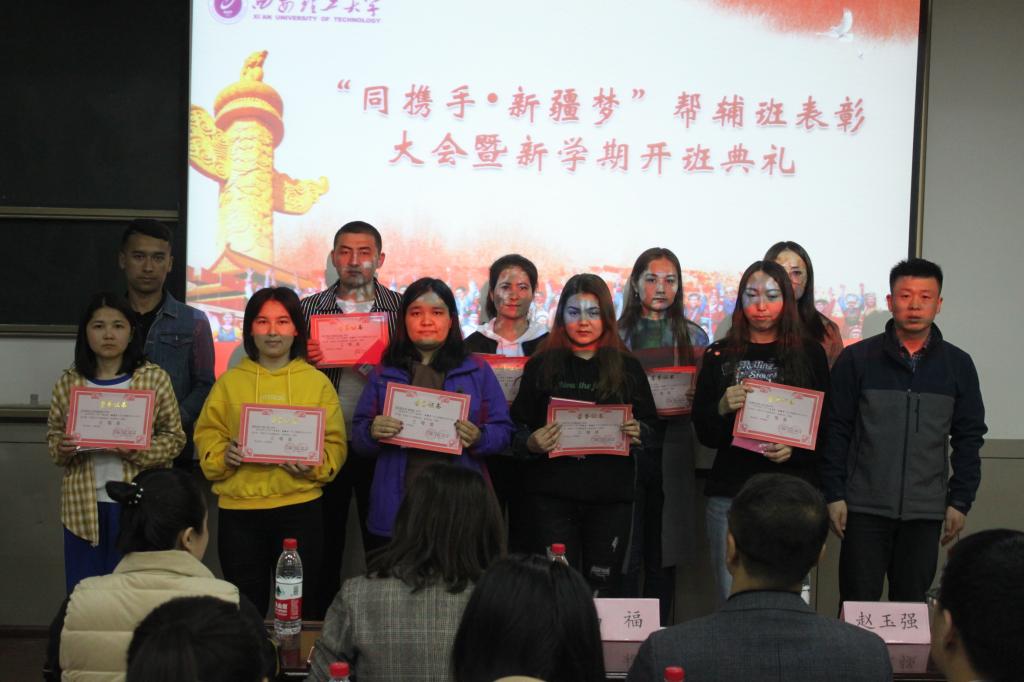 3月20日晚,williamhill英国威廉希尔“同携手·新疆梦”帮辅班表彰大会暨新学期开班典礼在曲江校区教10-107教室隆重举行。学工部部长马福,公司党委副书记兼副经理宗娜,williamhill英国威廉希尔学工办主任赵玉强,民族生教育管理中心马晓红、杨富成、梁雪蓉,各公司大一新疆籍少数民族员工辅导员以及帮辅班全体新疆籍少数民族员工及志愿者共计100余人参加本次表彰大会。表彰大会由williamhill英国威廉希尔辅导员林炳洪主持。