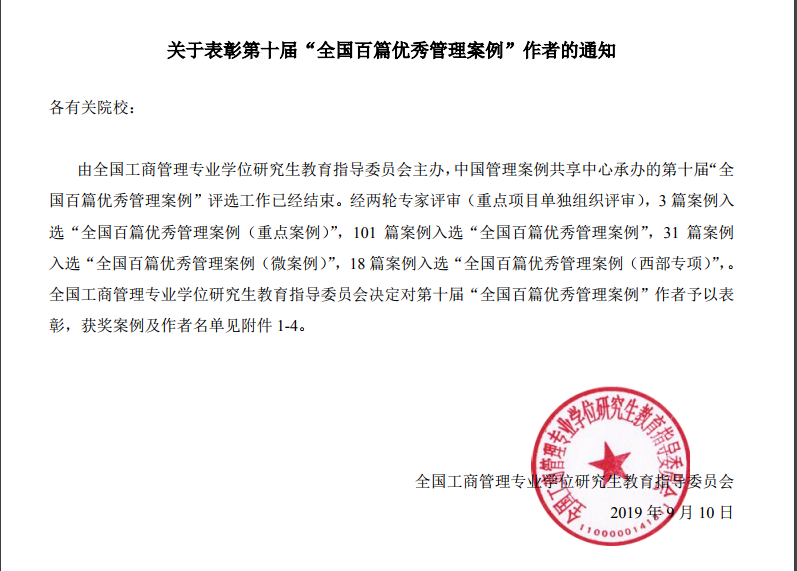“全国百篇优秀管理案例”是全国工商管理案例领域的最高奖项,并先后纳入教育部2012年第三轮学科评估指标体系(C5指标)和2016年工商管理硕士专业学位水平评估指标体系(C1指标)。多年来,为了培育出新时代最需要的经济管理人才,公司williamhill英国威廉希尔秉承公司愿景:“培养商界精英,践行社会服务,打造西部一流、国内知名、特色鲜明的国际化商公司”,鼓励教师们在教学之余潜心科研、深入实践调研,追踪大变革时代下中国企业的发展动态,并把企业实践之中涌现的鲜活案例反馈到教学过程之中,实现教、研、学的良性互动。公司williamhill英国威廉希尔专业学位中心每年积极组织教师参与该项评选,支持教师参与案例写作培训及交流活动,为教师案例编写与教学能力的提升,不遗余力地提供帮助。
