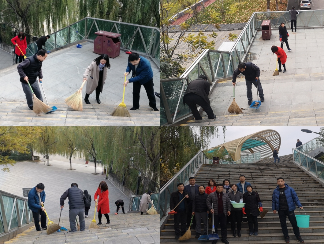 劳动现场大家进行了简单分工后,分别携带自备的水桶、水盆、笤帚、抹布和簸箕等打扫工具,两人一组、三人一队,有的打扫台阶上的树叶、有的擦拭扶手上的灰尘、有的清理地面上的泥土,大家相互配合,通力协作。参与劳动的所有党员不怕脏、不怕累,认真清扫 “理工桥”每个角落里的垃圾和树叶,经过近一个小时的紧张劳动,整个 “理工桥”由东到西焕然一新。看着在天桥上来来往往、欢声笑语的同学们,机关支部的党员老师也非常欣慰和开心。