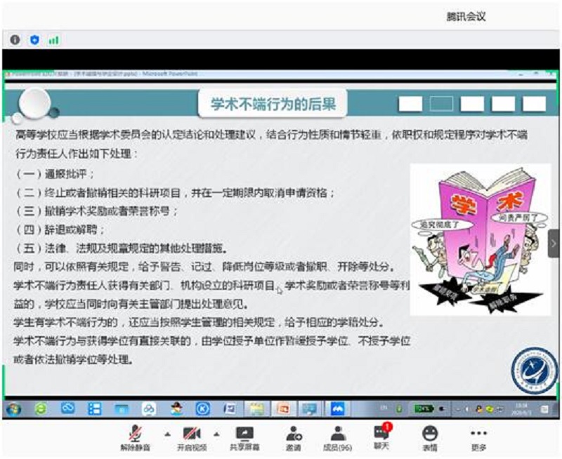 会上,张之光老师首先介绍了什么是学术诚信,带领同学们熟悉了教育部认定的七种学术不端行为,随后列举了一系列学术不端的典型案例向同学们警示,学术抄袭是学术论文的底线,抱着侥幸心理进行抄袭只会毁了一生前途。