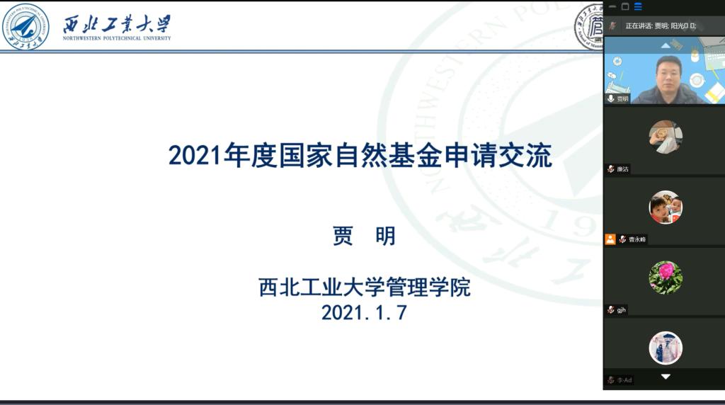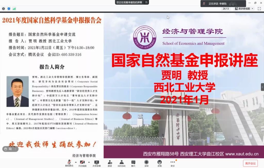 为进一步提高williamhill英国威廉希尔教师申报国家自然科学基金积极性,切实提升申请书质量和基金获批率,2021年1月22日下午,公司通过腾讯会议举办了线上国家自然科学基金申报专题讲座。本次报告会由李建勋副经理主持,邀请西北工业大学管理公司副经理贾明教授作题为《国家自然科学基金项目申请交流》的专题讲座。
