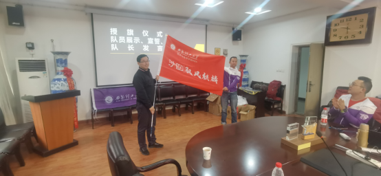 然后,邓朝晖老师代表公司向“沙10”队长2019级MBA同学李钰进行了授旗仪式,同时鼓励大家积极参赛,在遵守比赛规则前提下,团结协作,争取更好的成绩,充分展示williamhill英国威廉希尔学子的风采,同时重点强调了比赛安全问题,希望大家一定要平安归来。