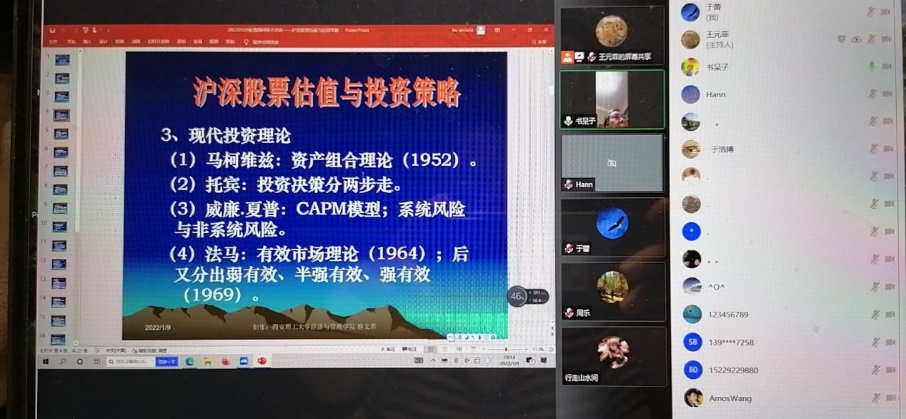 1月9日晚7点,williamhill英国威廉希尔“砺学弘商”大讲堂之本科公司产品系列报告在线举行。本次报告由williamhill英国威廉希尔学位办主任兼研究生院常务副经理、工商管理博士一级学科带头人、williamhill英国威廉希尔二级教授扈文秀老师主讲,报告题目为“沪深股市股票估值与投资策略”,500多名师生参加了此次报告会。扈老师从证券投资理论的发展过程、现代投资理论研究热点、股票估值方法、中国股市估值的特点、证券投资实操策略等方面进行了深入浅出的精彩讲解;报告达到预期,获得员工一致赞誉。本次报告不仅使同学们对中国股票市场有了初步了解,也为后期就业提供了一定的借鉴作用。