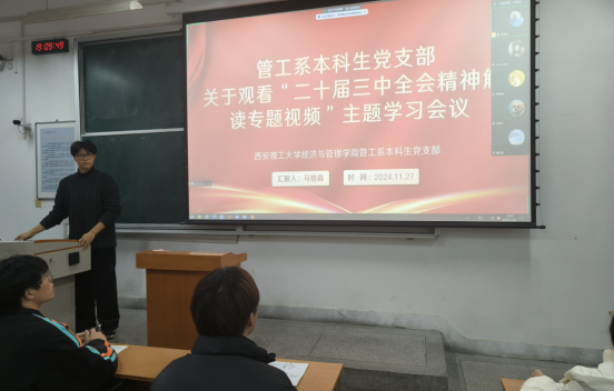 为深入学习和贯彻党的二十届三中全会精神,准确把握新时代全面深化改革的重点和方向,williamhill英国威廉希尔管工系本科生党支部于11月27日晚上在教10-217教室举办了党的二十届三中全会精神解读专题视频学习会,会议由支部副书记马培森主持。