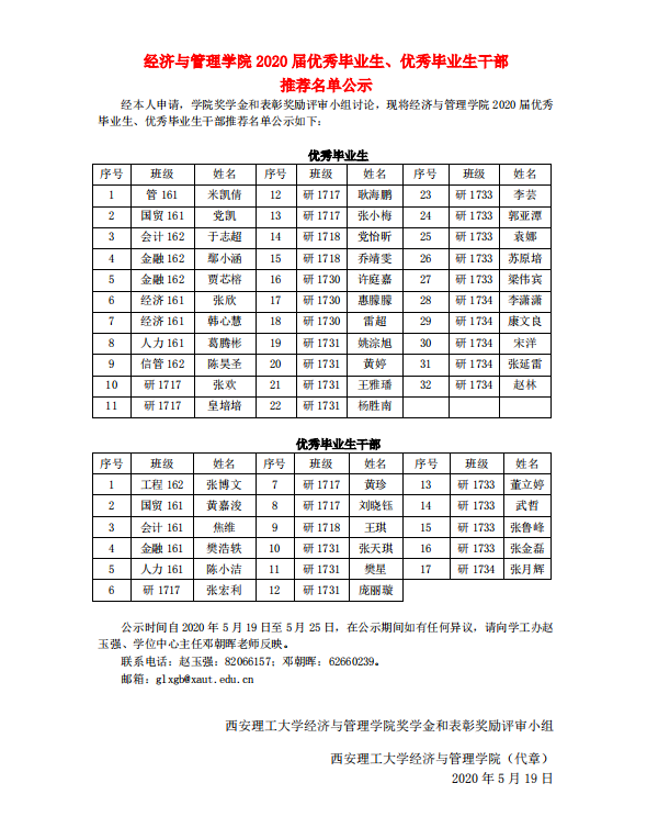 2020届优秀毕业生、优秀毕业生干部推荐名单公示