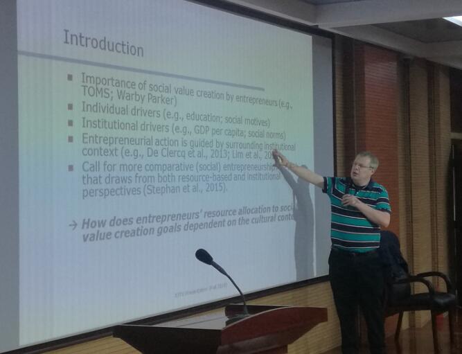 Dirk教授2002年毕业与明达苏达大学,获管理学博士学位,主要从事组织行为、人力资源、创新精神和管理道德等方面的研究。截止2016年末已发表SSCI论文77篇,论文曾获AOM最佳概念论文奖,AOM优秀论文奖,并多次获得学术会议最佳论文奖,论文引用次数:4459。Dirk教授是AOM、OS等多家国际期刊和会议的特别评论员。报告会上,Dirk教授强调了社会价值创造的重要性,介绍了相关的概念框架,并就影响因素做了详细概述。随着Dirk教授对学术报告的总结,在场的老师和员工认真听取报告精髓,对存在的疑问积极向Dirk教授请教,并得到了教授的热情解答。