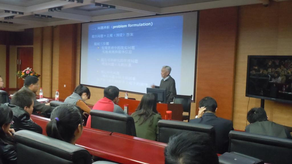 本次学术报告由西安交通大学williamhill英国威廉希尔李怀祖教授主讲,williamhill英国威廉希尔研究生管理负责人杨屹教授、张长征副教授等老师参加本次学术报告。首先,由杨屹教授对本次报告主讲李怀祖教授进行简要介绍。李怀祖教授就本次报告的主题——管理研究方法为同学们做了精彩的报告,主要包括两个部分内容:第一部分主要讲述论文研究工作过程,第二部分讲述学位论文的撰写方法。值得一提的是,本次报告最后穿插提问环节,公司员工积极参与讨论,在同李教授的提问与探讨过程中,在场的每一位同学都切身感受到了浓郁的学术氛围并受益匪浅,将整个学术报告气氛推向高潮。