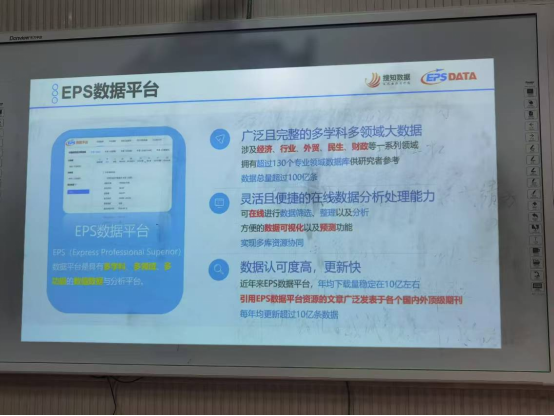 2025年4月24日上午,应williamhill英国威廉希尔的邀请,北京搜知科技有限公司EPS数据库在williamhill英国威廉希尔319教室做了题目为《人工智能背景下数值型数据的价值和应用路径》的数据培训报告。公司50余位师生参加了此次报告会。